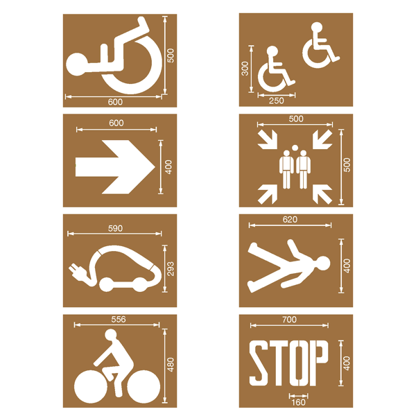 - 8 pochoirs divers : handicapé x 2, vélo, flèche, piéton, stop, zone recharge véhicule électrique, point de rencontre.