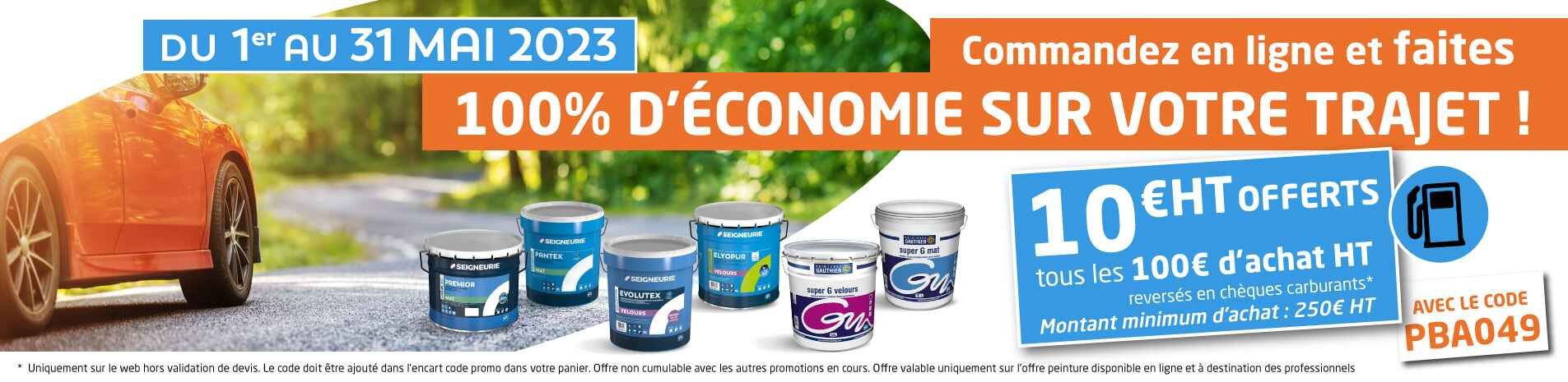 10€ HT tous les 100€ HT reversés en chèques carburants* pour tout achat de peintures sur le site internet**. Rien de plus simple, il suffit de renseigner le code promo PBA049 dans votre panier dans l'encart Code de Réduction.