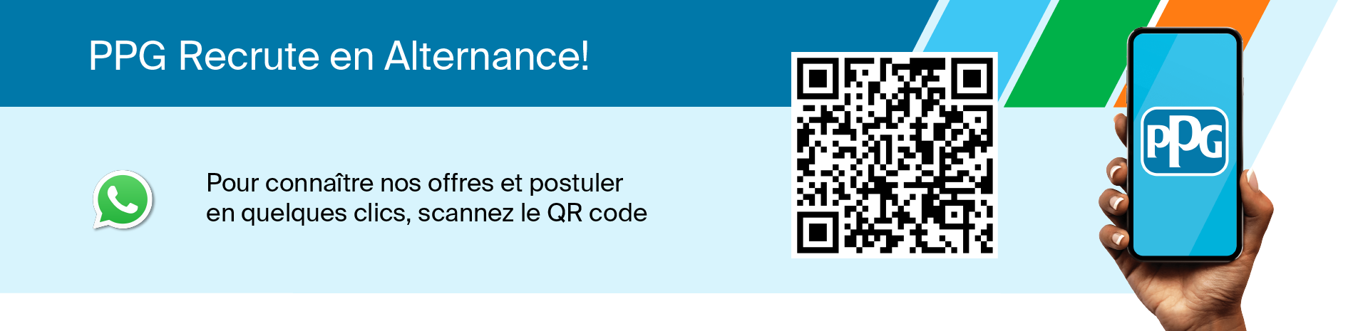 Pour retrouver ces opportunités, il suffit de taper Alternance dans la fenêtre « rechercher des offres par mot-clé » sur le site PPG Careers ou d’utiliser le flashcode partagé ici.